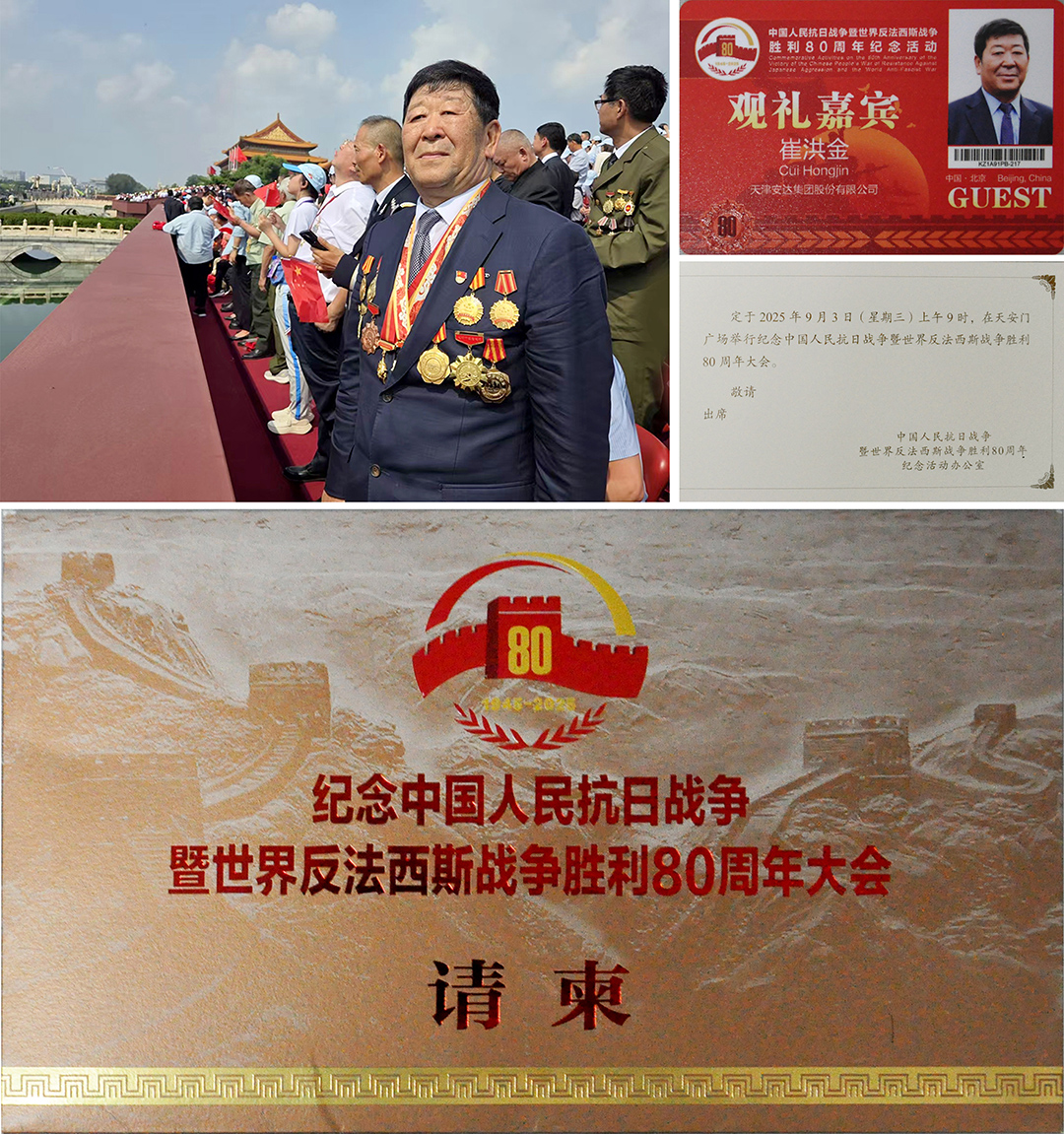 2025 9 3 日,天安門(mén)廣場(chǎng)旌旗獵獵、號角嘹亮,中國人民抗日戰爭暨世界反法西斯戰爭勝利 80 周年閱兵式在此隆重舉行。安達集團黨委書(shū)記、董事長(cháng)崔洪金作為全國最美擁軍人物代表受邀出席,在現場(chǎng)見(jiàn)證這一彰顯國威軍威的歷史性時(shí)刻。